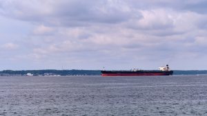 Et olietankskib uden synligt flag og navn sejler gennem Øresundsstrædet i august 2025. Foto: Shutterstock